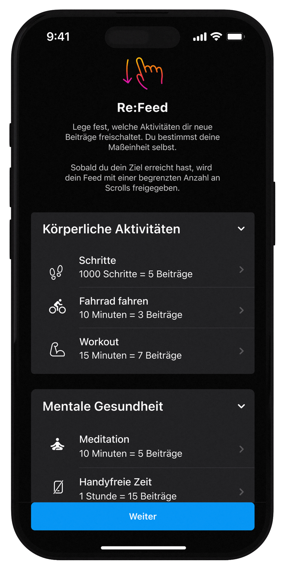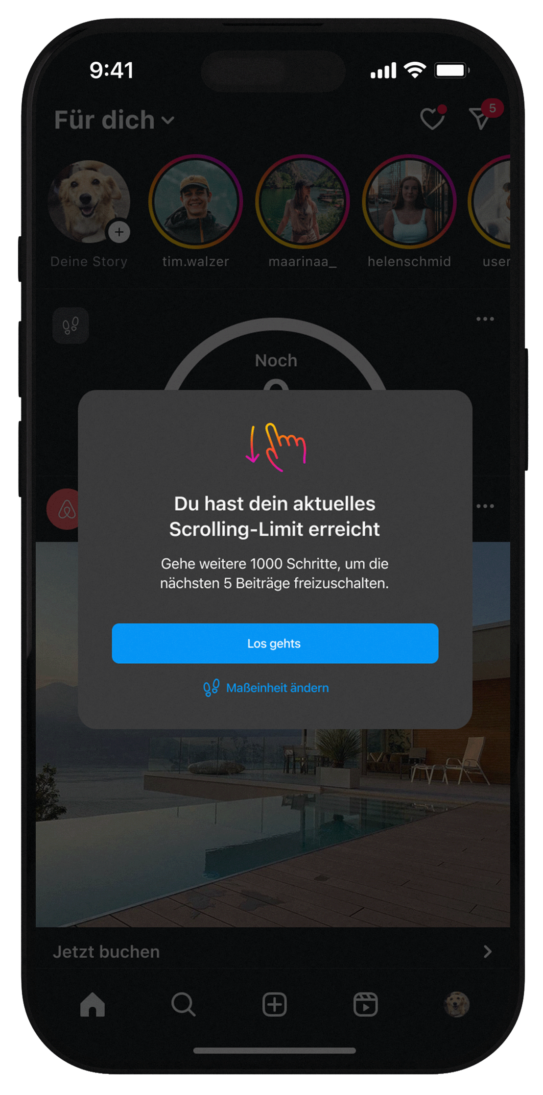 Beiträge bewusst konsumieren statt sich darin zu verlieren. Mit jeder Aktivität im echten Leben schaltest du dir neue Beiträge frei.